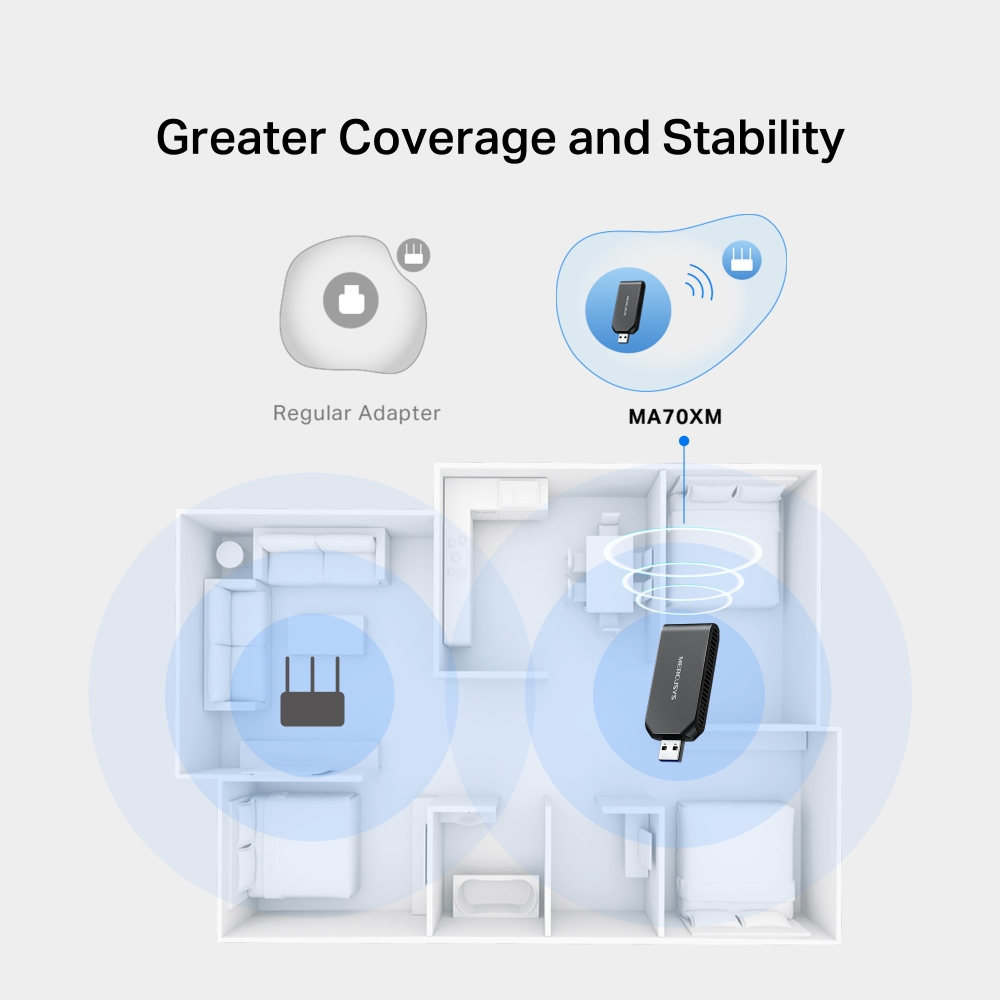 †Maximum wireless signal rates are the physical rates derived from IEEE Standard 802.11 specifications. Actual wireless data throughput and wireless coverage are not guaranteed and will vary as a result of network conditions, AP limitations, and environmental factors, including building materials, obstacles, volume and density of traffic, and AP location. ‡Use of WPA3 requires APs to also support the corresponding feature. To use WPA3, you may need to upgrade the drivers which can be downloaded on the official website of MERCUSYS. §Use of Wi-Fi 6 (802.11ax) and features including OFDMA, MU-MIMO and 1024-QAM requires APs to also support the corresponding features. *Functionality may be restricted on some operating systems and platforms. To ensure compatibility, you may need to update the adapter's drivers after an OS update. You can find our latest drivers in the download center at http://www.mercusys.com