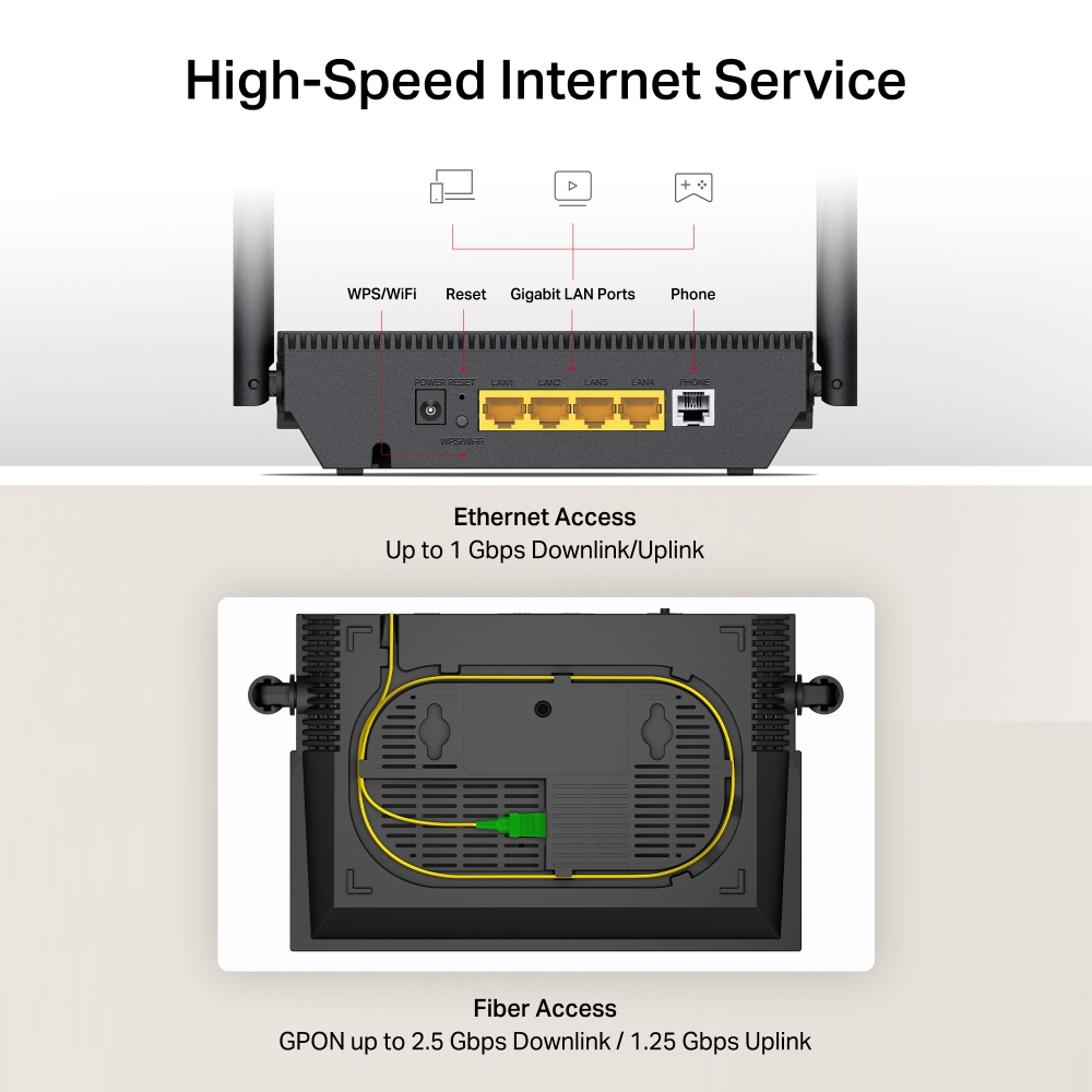 With dual-mode GPON and EPON, MF30Gv provides internet speeds up to 2.5 Gbps via GPON, meeting high-speed home networking needs.