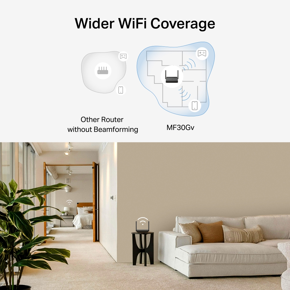 MF30Gv is compatible with EasyMesh, enabling you to set up a whole home mesh network with one WiFi name and password with any other routers or APs that support EasyMesh from multiple vendors. Enjoy flexible, scalable, and seamless mesh WiFi throughout your home!**