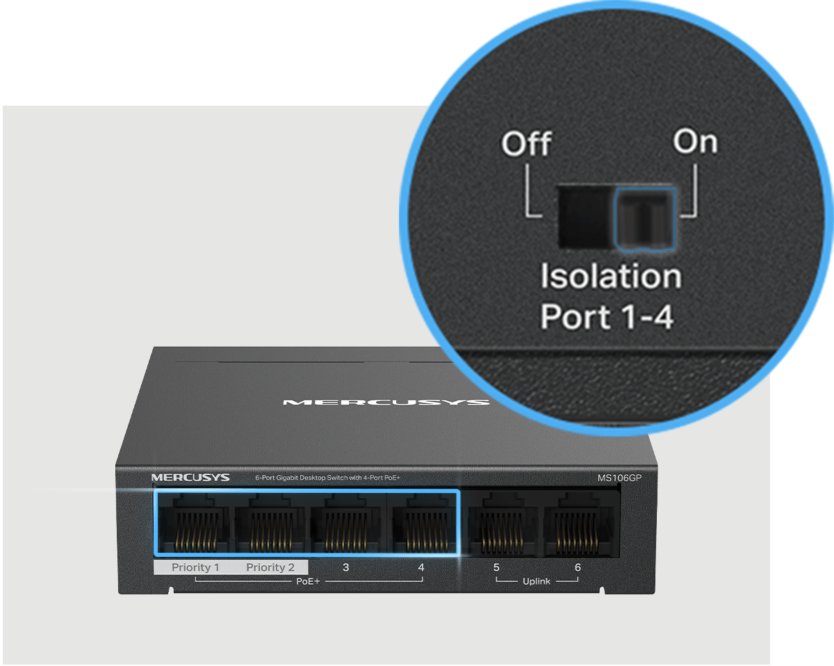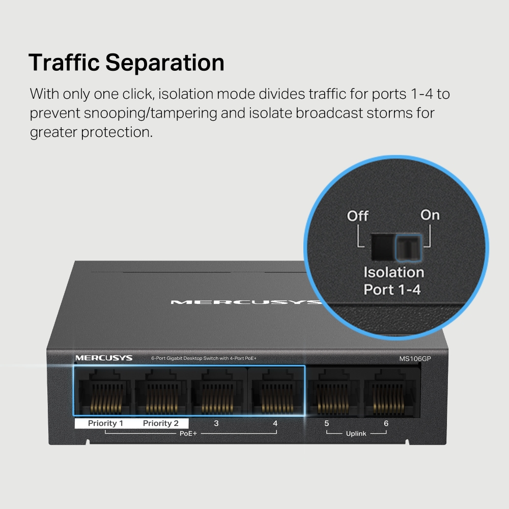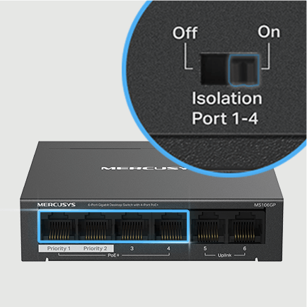 With only one click, isolation mode divides traffic for ports 1-4 to prevent snooping/tampering and isolate broadcast storms for greater protection.