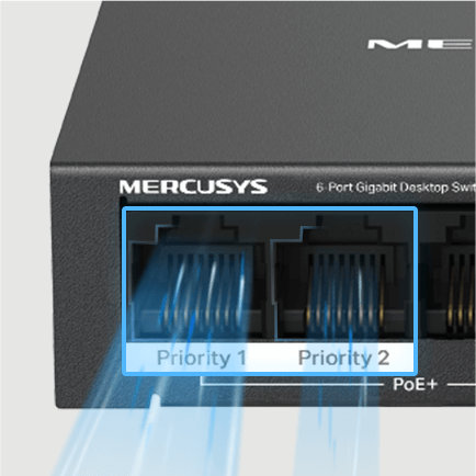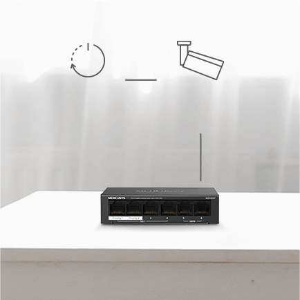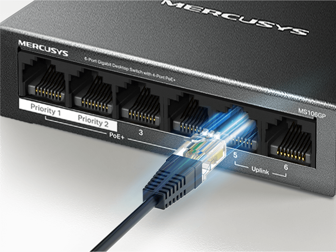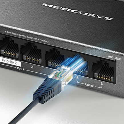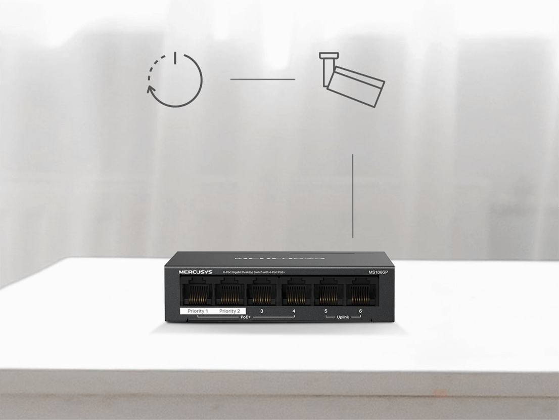 - 2× Uplink Ports: MS106GP provides 2× uplink ports when turning on the isolation mode. One for connecting to the Internet and one for connecting to the NVR