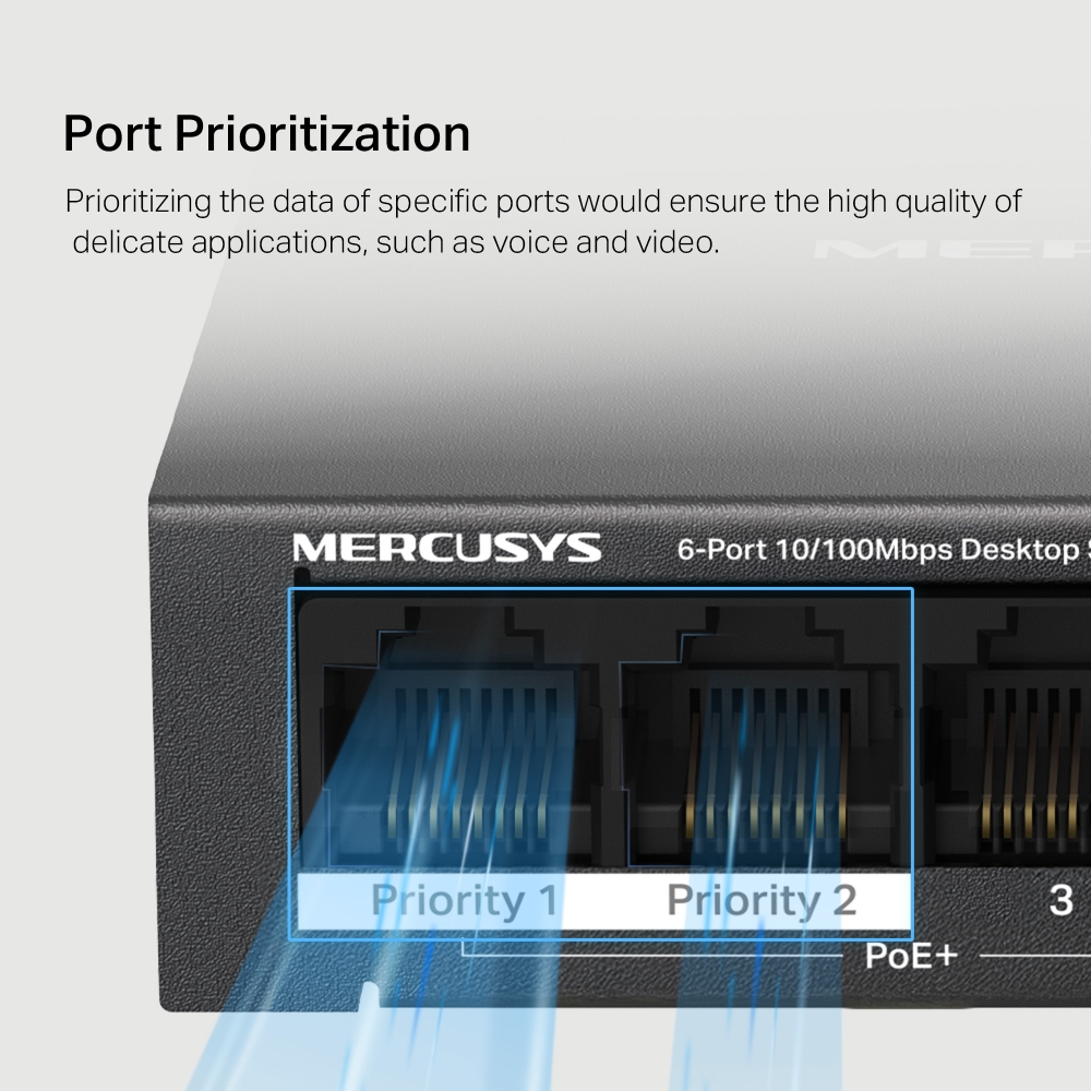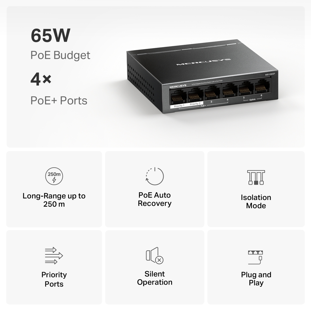 - Fast Gigabit Ports: 6×Gigabit RJ45 ports with 4 PoE+ ports