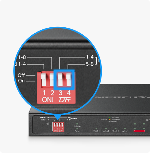 • Extend Mode Button (Ports 1–4, Up to 250 m PoE power supply and data transmission)