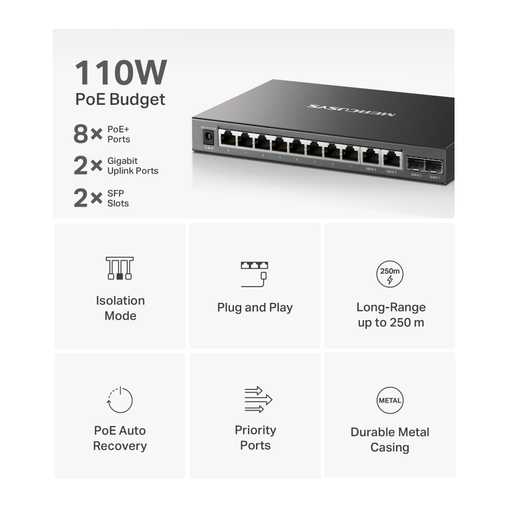 - 8× PoE+ ports transfer data and power via a single cable with a total power budget of 110 W*