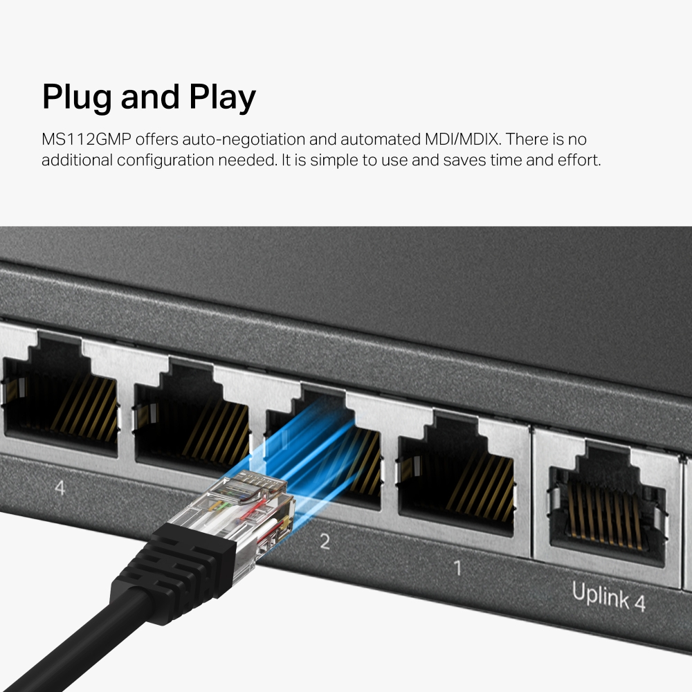 MS112GMP offers auto-negotiation and automated MDI/MDIX. There is no additional configuration needed. It is simple to use and saves time and effort.