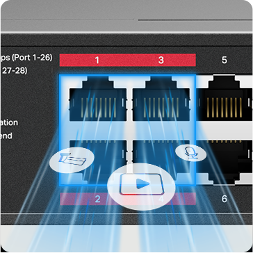 Compliant with the 802.3af/at Powered Devices, each of the 24 PoE+ ports supports a maximum power supply of 30 W. The total 295 W PoE power budget* can be applied in various scenarios, including surveillance, offices, and small businesses, since MS128GP is fully compatible with devices such as IP cameras, access points, IP phones, PCs, video recorders, and etc.
