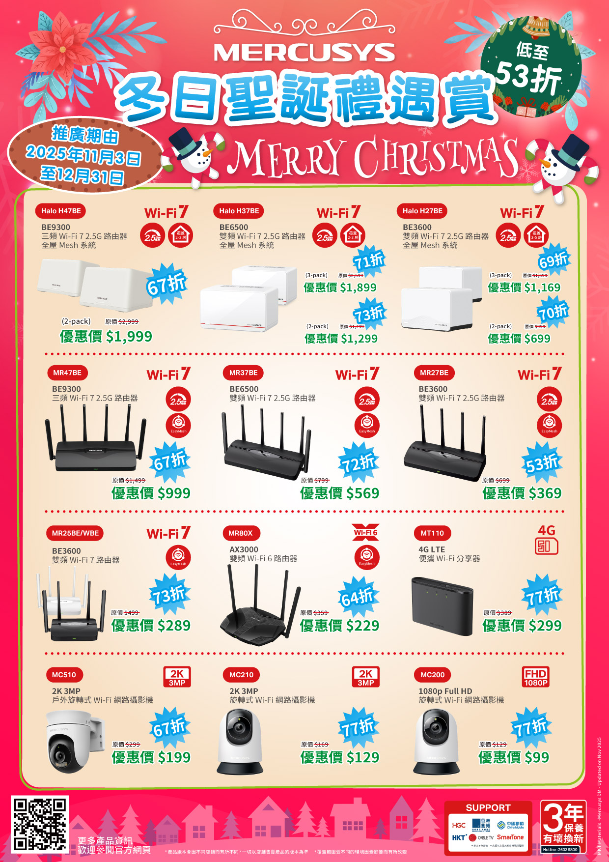 - Mercusys冬日聖誕禮遇賞低至53折 (推廣期由2025年11月3日至12月31日)