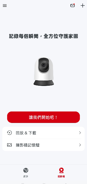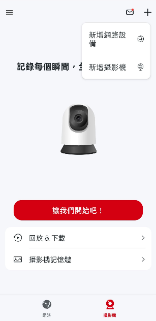 2.點選 APP 右上角 中的 + 選擇 新增攝影機 的選項。
