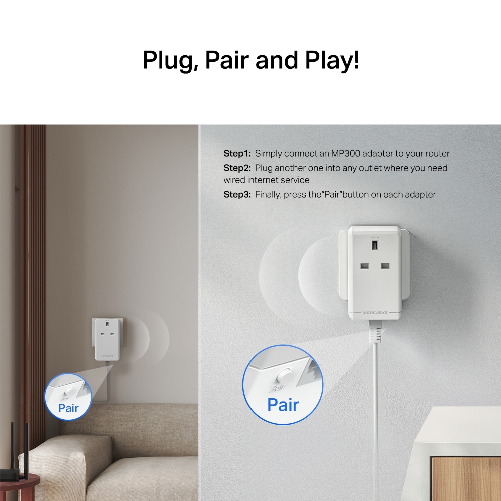 Simply push the Pair button on the adapters and quickly set up a more secure Powerline network